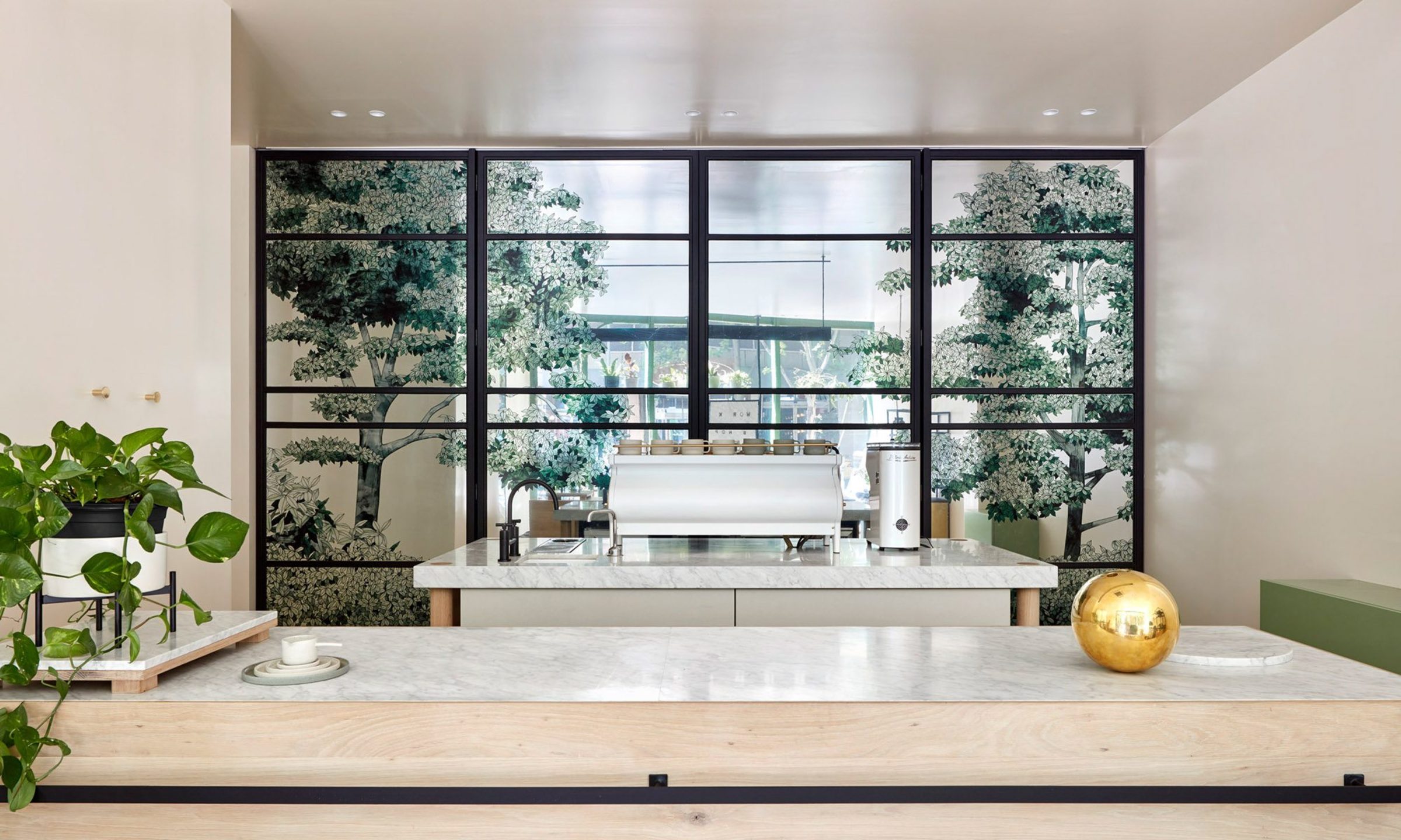 The design maximises the space with gently curved walls to draw the eye towards the central coffee counter, while back of house activity is concealed behind a lush green landscape by Beth Emily on giant mirrored screens. The walls are accented with a glossy pink hue and clean brass lines (not to mention a punch of 80s granite here and there for grit), while both green tones and literal greenery add a tranquil vibe to the space.