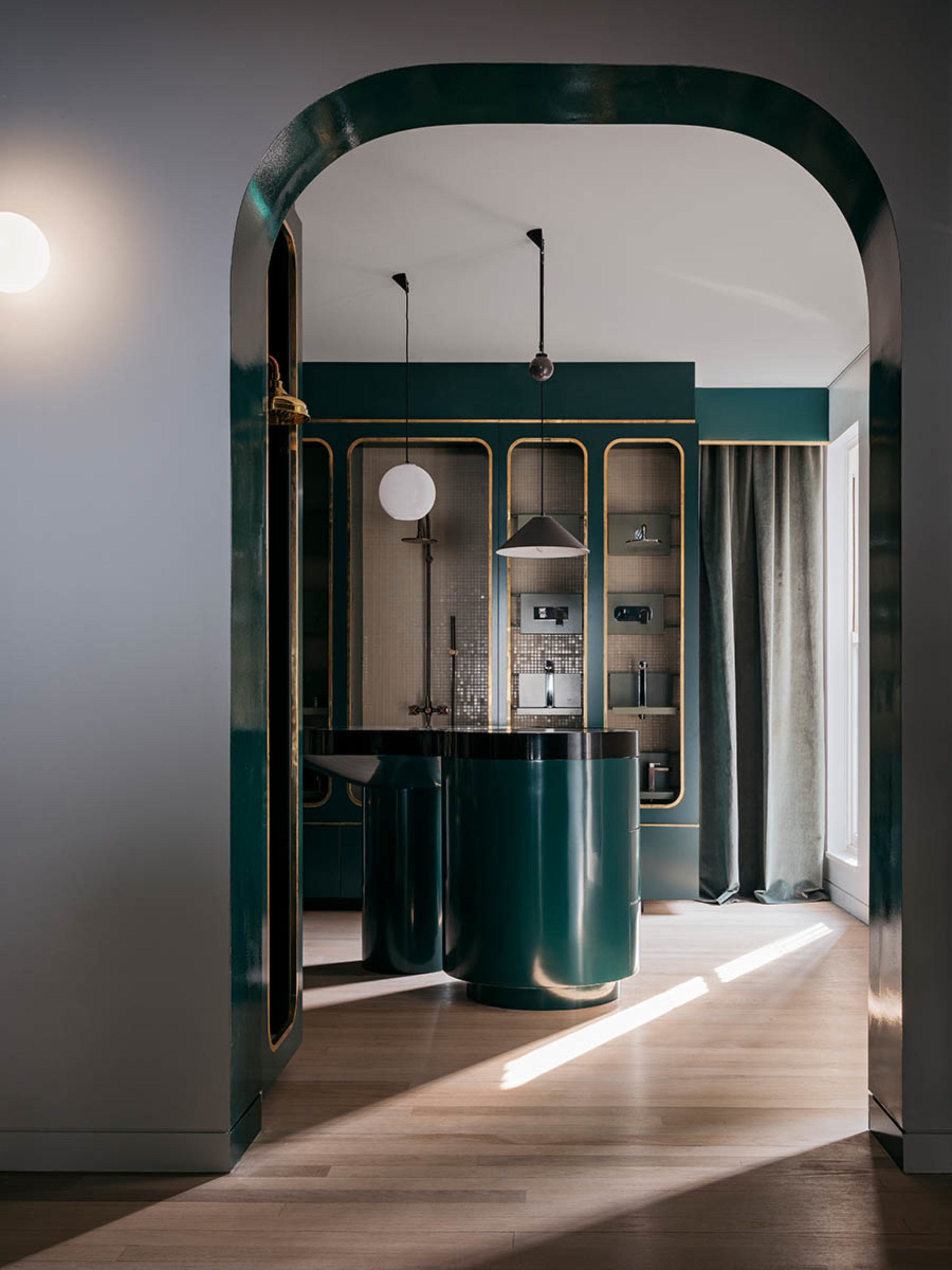 The showroom is completed with a library that houses the myriad of ranges of tapware in a calming green and brass bordered setting that shimmers and shines